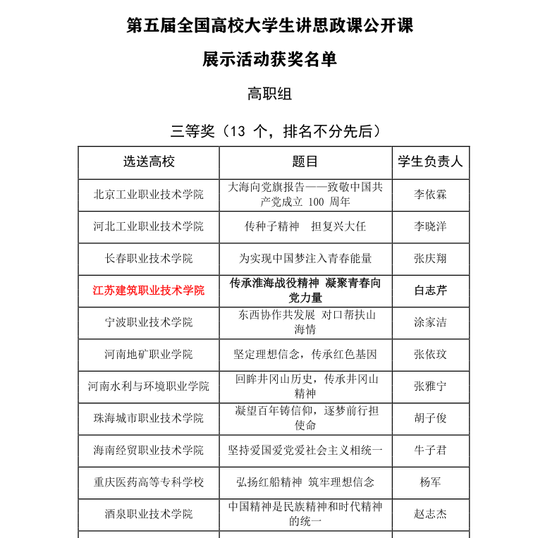 为深入贯彻落实习近平总书记关于深化思想政治理论课改革创新和加强党史教育的重要指示批示精神,充分发挥思想政治理论课作为立德树人关键课程的作用,近日,由教育部高校思想政治理论课教学指导委员会主办的“百年辉煌路 奋斗正当时”——第五届全国高校老员工讲思政课公开课展示活动评选结果揭晓。由公司朱敏、于静、赵先菊三位老师指导、经管公司酒店19-1班白志芹同学主讲的作品《传承淮海战役精神 凝聚青春向党力量》荣获全国高校老员工讲思政课公开课展示活动三等奖。