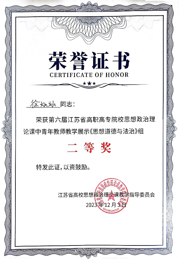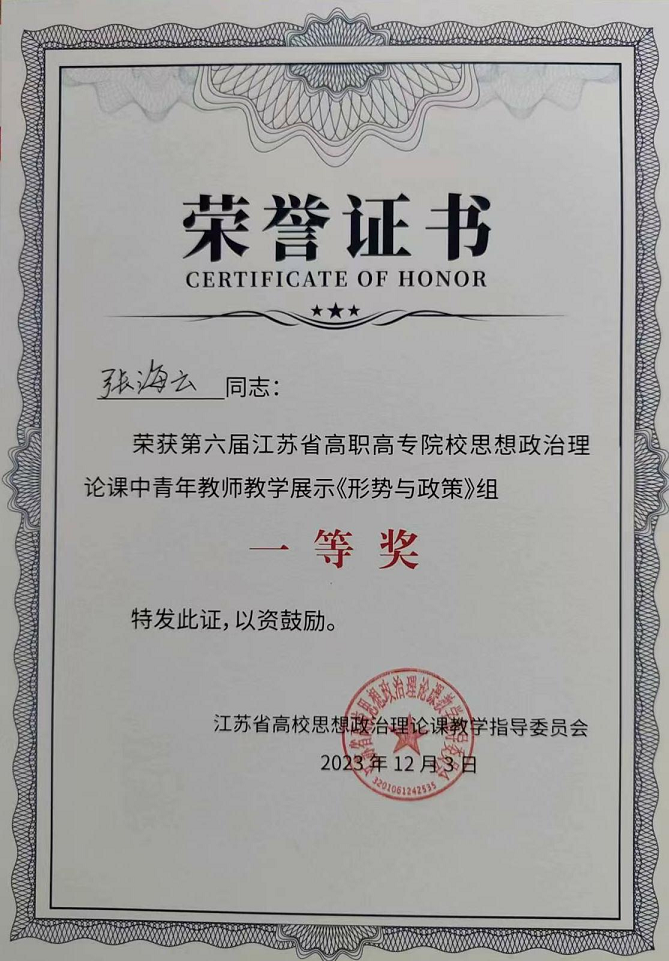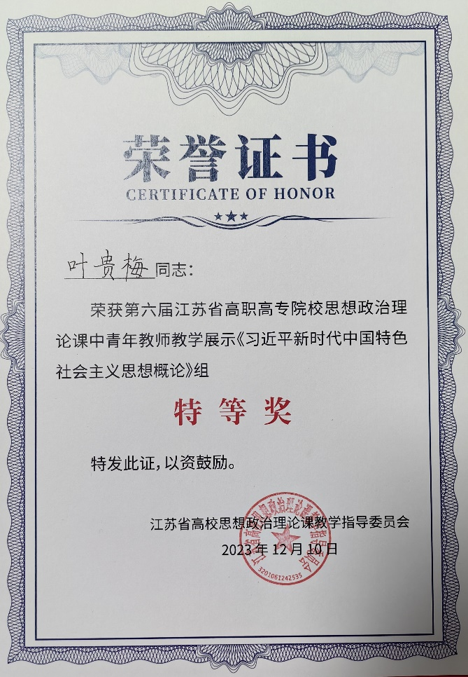 近日,江苏省高校思想政治理论课教学指导委员会公布了第六届江苏省高职高专院校思想政治理论课中青年教师教学展示活动评选结果。经现场分课程教学展示,四门课程共评出特等奖11项,一等奖38项,二等奖46项。公司叶贵梅老师获《习近平新时代中国特色社会主义思想概论》组特等奖,张海云老师获《形势与政策》组一等奖,徐灿灿老师获《思想道德与法治》组二等奖。