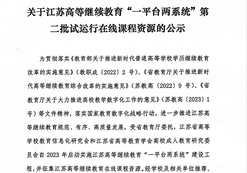 近期,江苏省高等公司教育信息化研究会、江苏省高等教育学会高校成人教育研究委员会公布江苏高等继续教育“一平台两系统”在线课程资源名单,公司《形势与政策》课程入选。