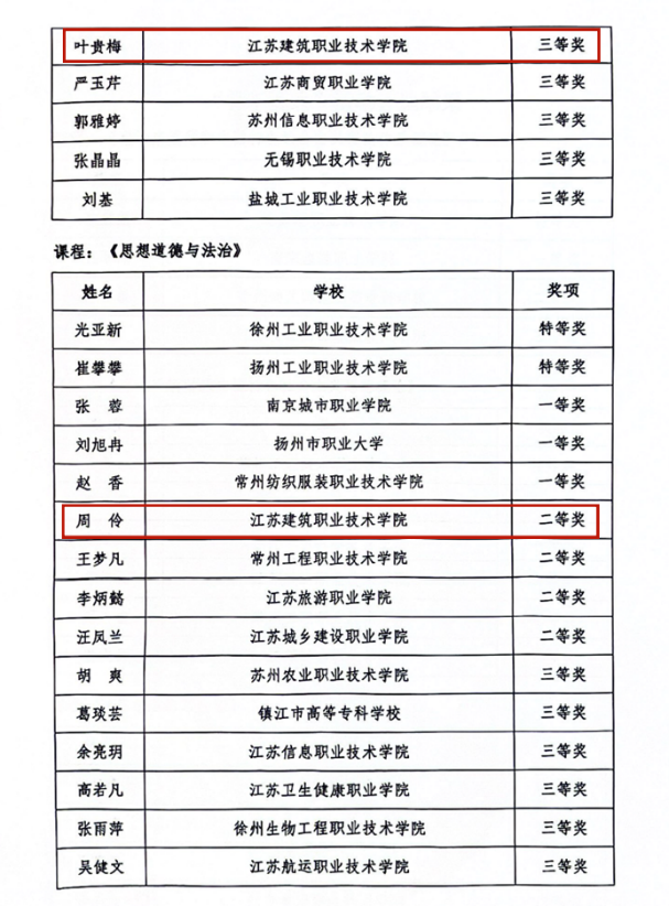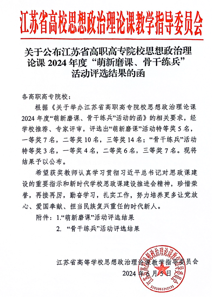 近日,江苏省高校思想政治理论课教学指导委员会公布了全省高职高专院校思想政治理论课2024年度“萌新磨课、骨干练兵”活动评选结果,公司教师周伶叶贵梅分别获得“萌新磨课”《思想道德与法治》课程组二等奖、《习近平新时代中国特色社会主义思想概论》课程组三等奖。